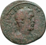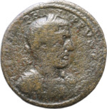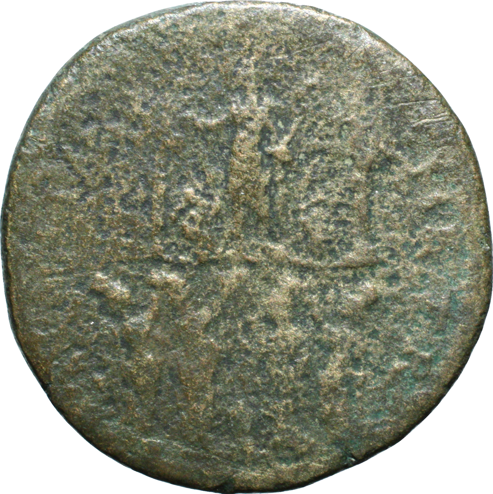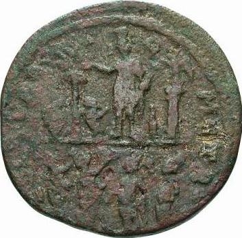 Astarte standing facing, placing right on palm tree to left and holding sceptre, crowned by Victory on column to right; on her side, Marsyas standing, club, and murex shell; below, four Tychai standing, with altar in between, sacrificing to Astarte: the first is right, looking up with upraised right hand; the second is right, looking up and holding with upraised right hand dish with offerings; the third is left, looking down and pouring libation on altar; the fourth is left, holding with upraised right wreath |
