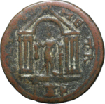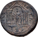 temple with six columns and arched pediment enclosing Astarte standing facing, placing right on trophy to left and holding sceptre, crowned by Victory on column to right; in exergue, palm tree, altar, and murex shell