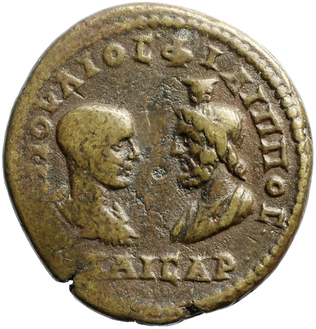 confronted busts of Philip II, bare-headed, draped and cuirassed, right, seen from rear, and Sarapis, draped, left