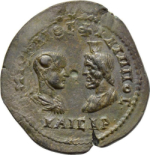 confronted busts of Philip II, bare-headed, draped and cuirassed, right, seen from rear, and Sarapis, draped, left