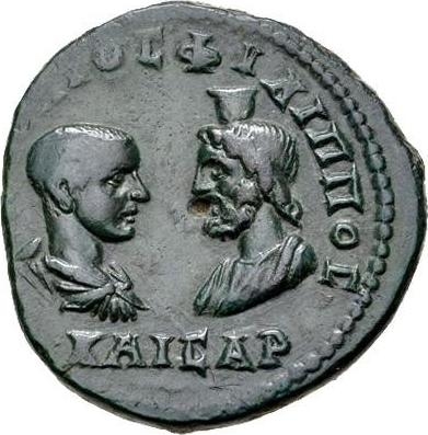 confronted busts of Philip II, bare-headed, draped and cuirassed, right, seen from rear, and Sarapis, draped, left