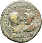 confronted busts of Philip II, bare-headed, draped and cuirassed, right, seen from rear, and Sarapis, draped, left
