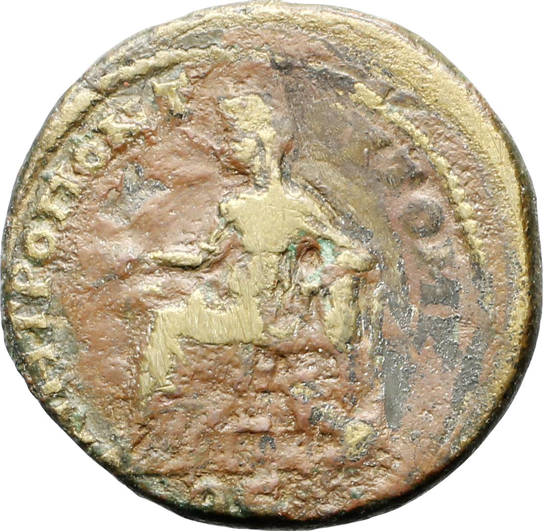 Cybele seated left, holding patera and resting arm on tympanum; at feet, left of the throne, lion