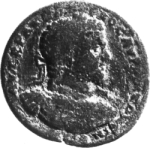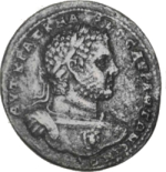 Asclepius standing facing, holding serpent staff, and Caracalla, togate, standing left, holding patera over altar and sceptre |