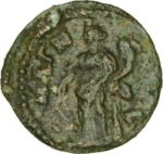 Tyche standing facing, head left, holding rudder in her right hand, cornucopia in left