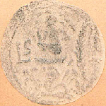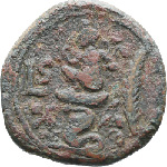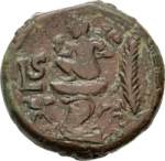 Harpocrates, crowned with skhent, seated on lotus-flower, left, raising finger to lips, holding flail; below, serpent erect, left and two ears of corn and poppy; at right, palm