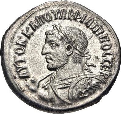 laureate and cuirassed bust of Philip I, left, seen from front, wearing balteus, holding spear resting on shoulder and shield (decorated with Philip I riding on galloping horse left, spearing enemy seated on ground)