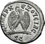 eagle standing right, head left, on palm, spreading wings, holding wreath in beak