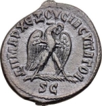eagle standing right, on palm, spreading wings, holding wreath in beak |