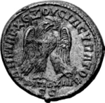 Obverse design laureate and cuirassed bust of Philip I, left, seen from front, with gorgoneion on cuirass; below bust: ••