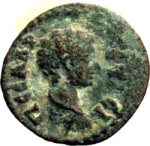bare-headed, draped and cuirassed bust of Geta, right, seen from rear