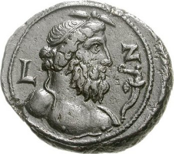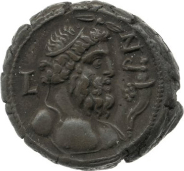 bust of Nilus, right, crowned with taenia and lotus-buds, drapery on left shoulder; before, cornucopia from which issues Genius holding wreath