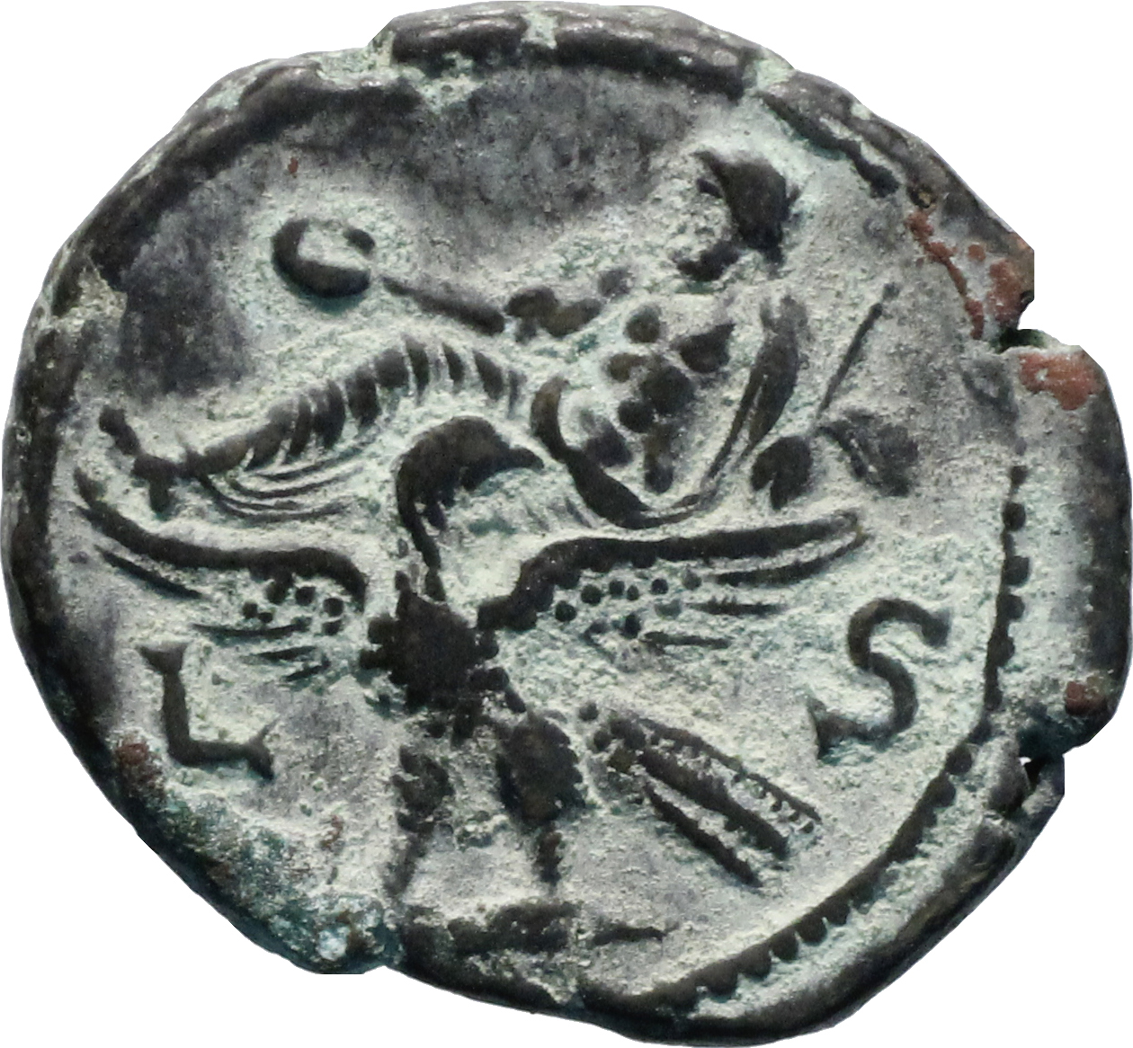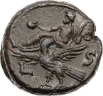 eagle standing facing, head right, spreading wings, supporting Zeus seated left, holding patera and sceptre