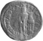 Apollo standing facing, head right, holding wreath, arm resting on tripod |