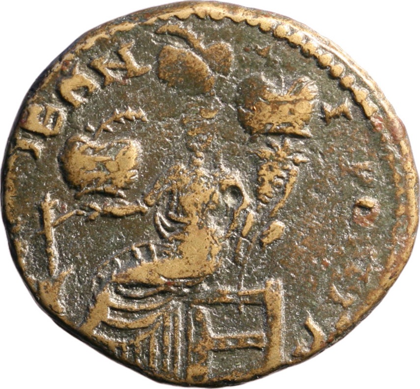 Tyche seated left, with prize crown on head, holding rudder and cornucopia with prize crown in left; to left, prize crown |