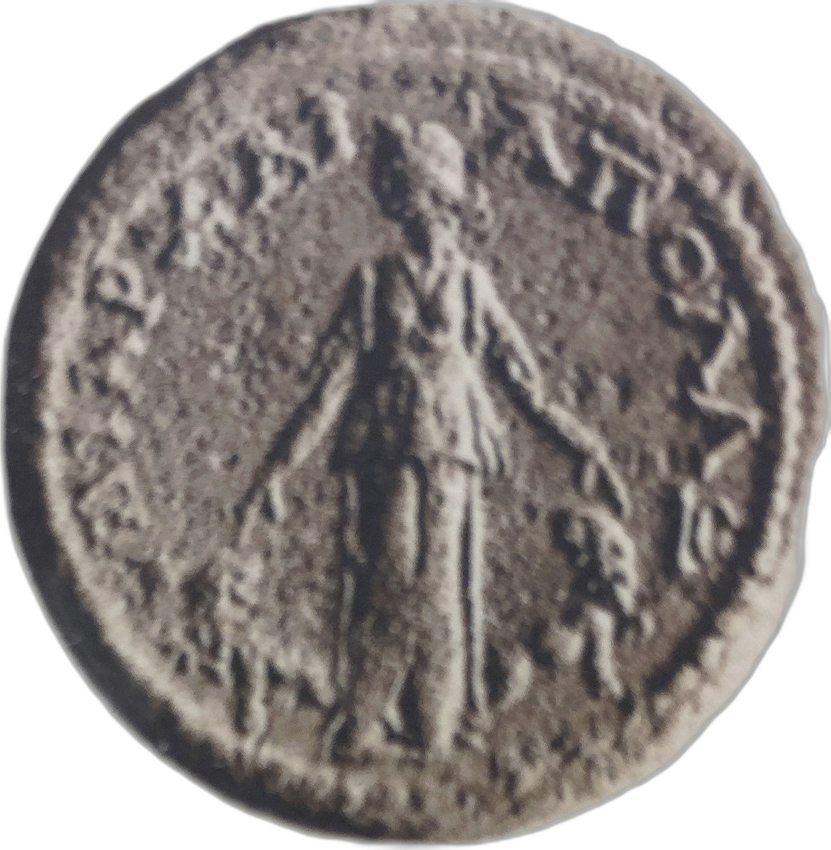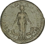 Cybele standing, facing, head, left, wearing kalathos; between two seated lions |