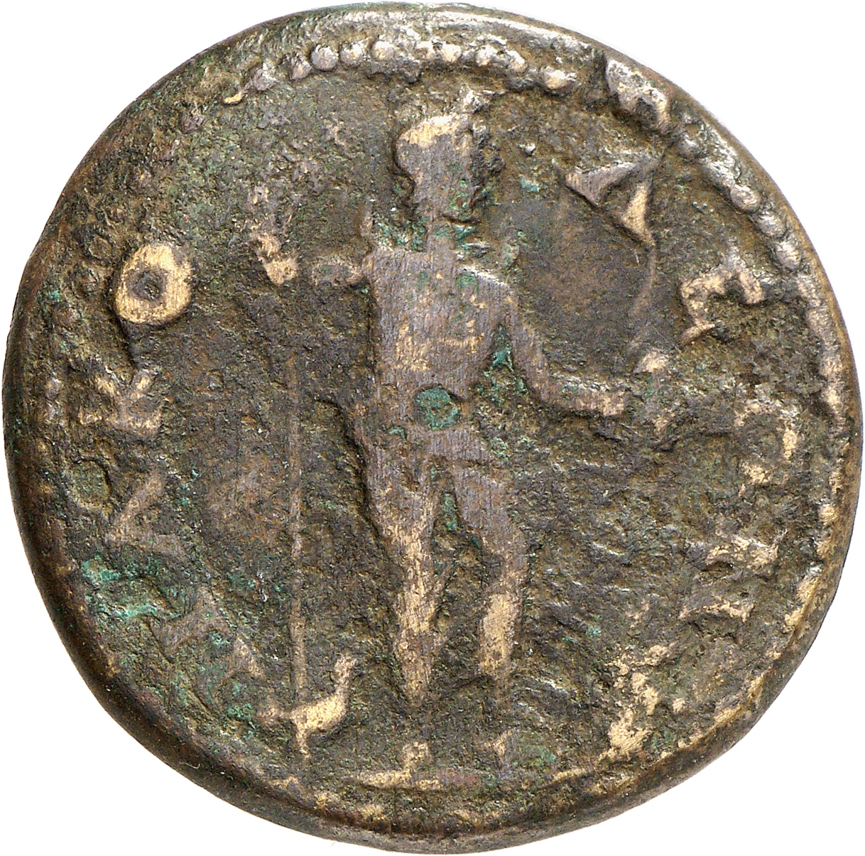 Mên standing right, crescent behind shoulders, holding pine cone and spear, foot on bucranium