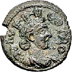 draped bust of Tyche, right; behind her, inscribed vexillum