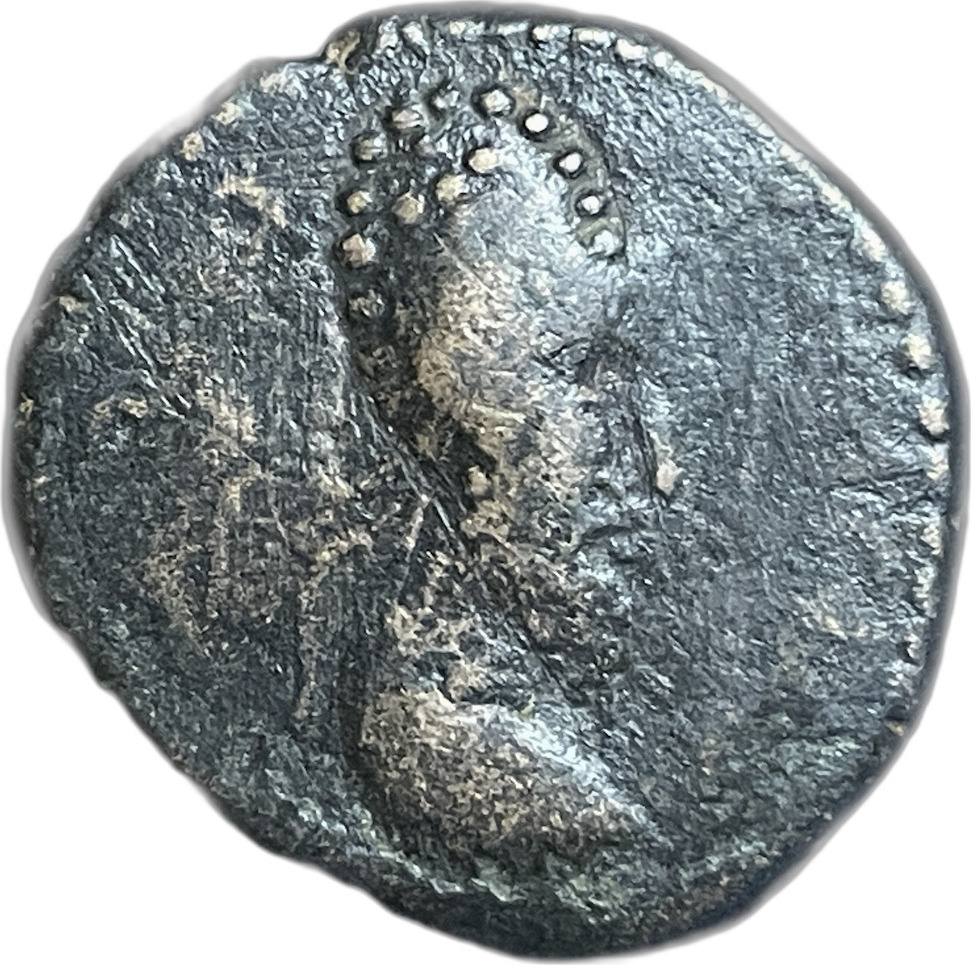 draped bust of Abgar (bearded) wearing diademed tiara with crest of hook-shaped ornaments, right; to right, sceptre