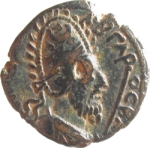 draped bust of Abgar (bearded) wearing diademed tiara with crest of hook-shaped ornaments, right; to right, sceptre