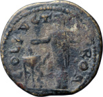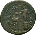 cult statue of Apollo Smintheus standing on short column, left, with quiver on shoulder, holding patera and bow; at left, tripod entwined by serpent