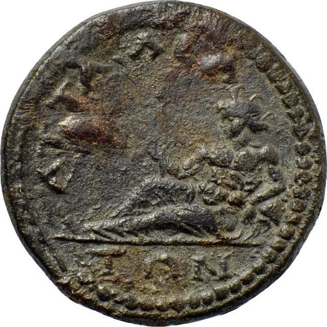 river god (Lycos) reclining left, holding reed, and resting on water urn