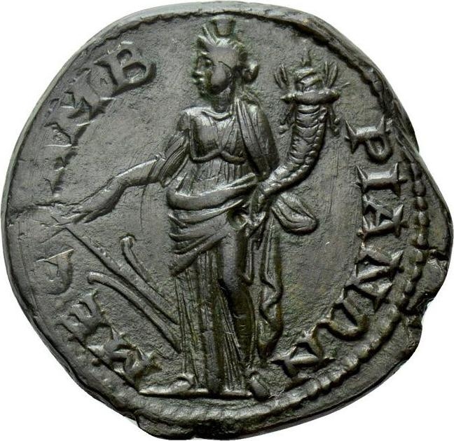 Tyche standing left, holding rudder and cornucopia