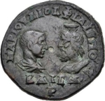 confronted busts of Philip II, bare-headed, draped and cuirassed, right, seen from rear, and Sarapis, draped, left