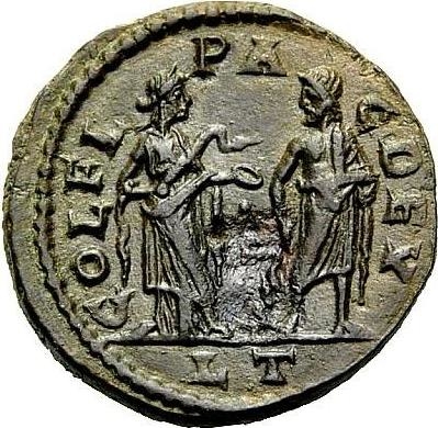 Salus standing right, feeding serpent from patera, facing Asclepius standing facing, head left, holding serpent staff