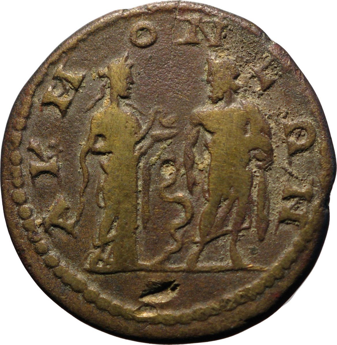 Hygieia standing right, feeding serpent from patera, facing Asclepius standing left, holding serpent staff