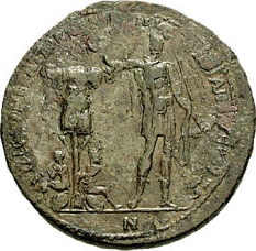 Septimius Severus standing facing, head left, placing hand on trophy and holding spear; at feet of the trophy, two seated seated on shield |