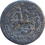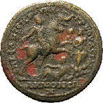 hero Akmôn with flying chlamys, holding whip, galloping right, towards Dindymos hill, on which stand two nymphs (Oreiades); at foot of the hill, a river god (Sindros), reclining left |