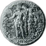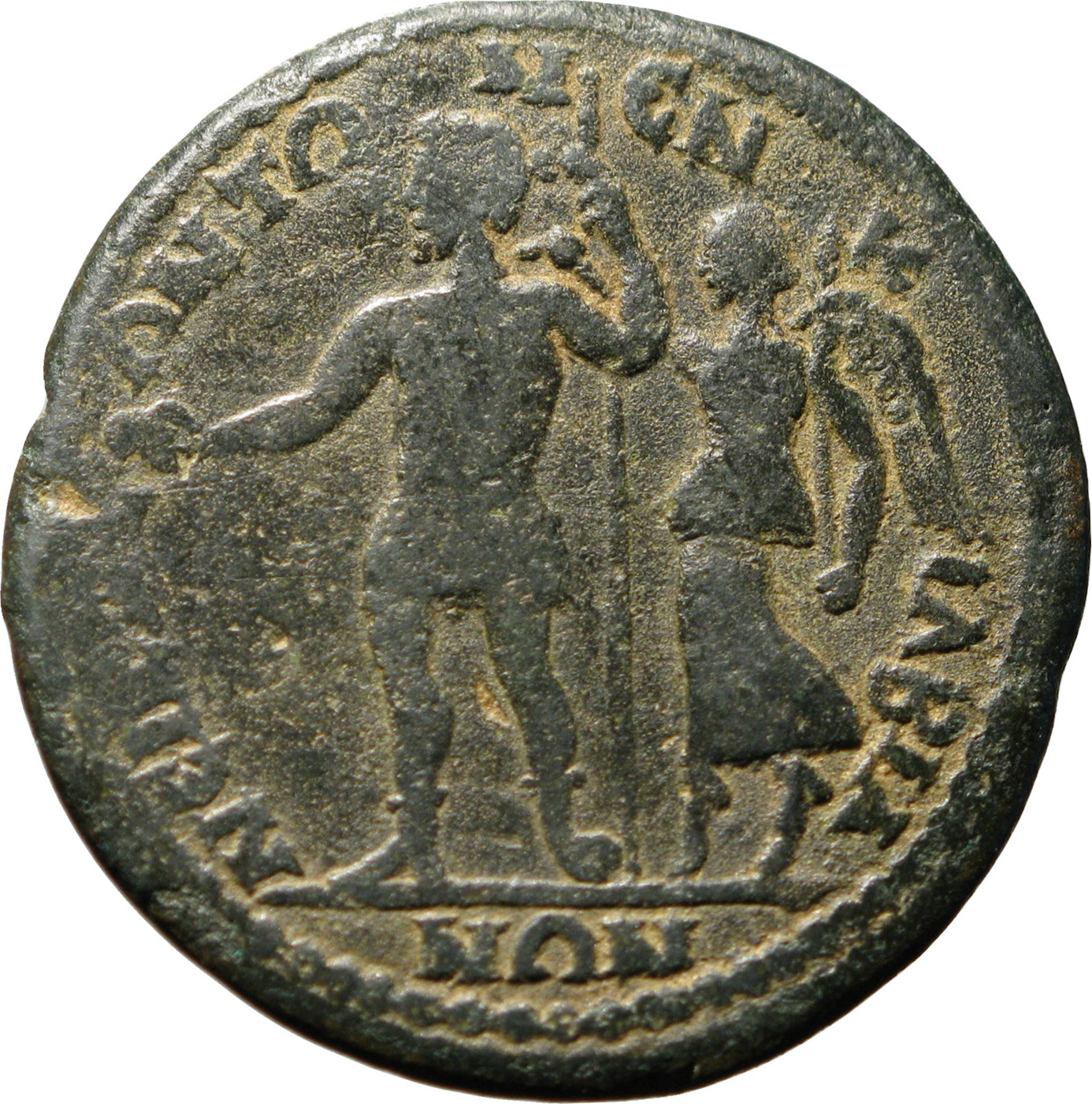 Septimius Severus standing left, holding patera and sceptre, crowned by Nike standing left, holding palm