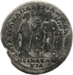 Hygieia standing right, feeding serpent from patera, facing Asclepius standing facing, head left, holding serpent staff |