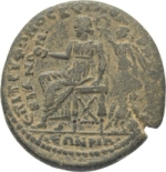 uncertain female deity seated left, holding patera, crowned by Nike left, flying above eagle standing right, head left, spreading wings |