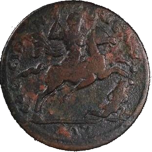 Emperor (Septimius Severus or Caracalla?) in military dress with cloak floating behind him, on horse prancing right, brandishing in right hand spear at enemy advancing right, head left