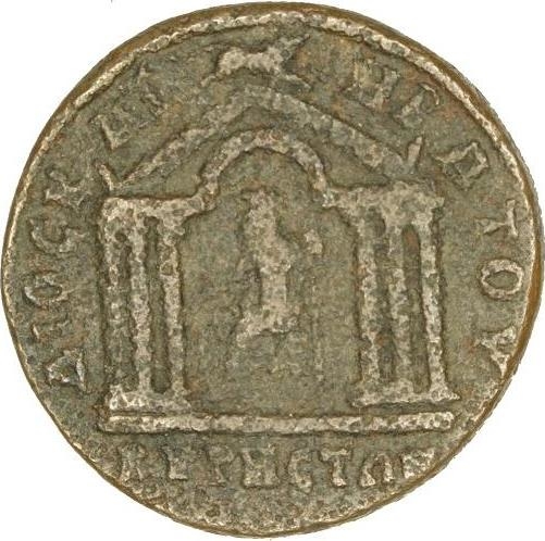 temple with six columns enclosing Zeus seated left, holding sceptre and thunderbolt, eagle at feet, garlands or curtains above; above temple, bull (?) leaping right