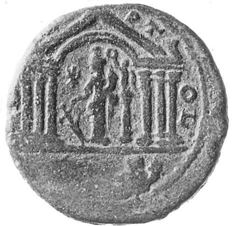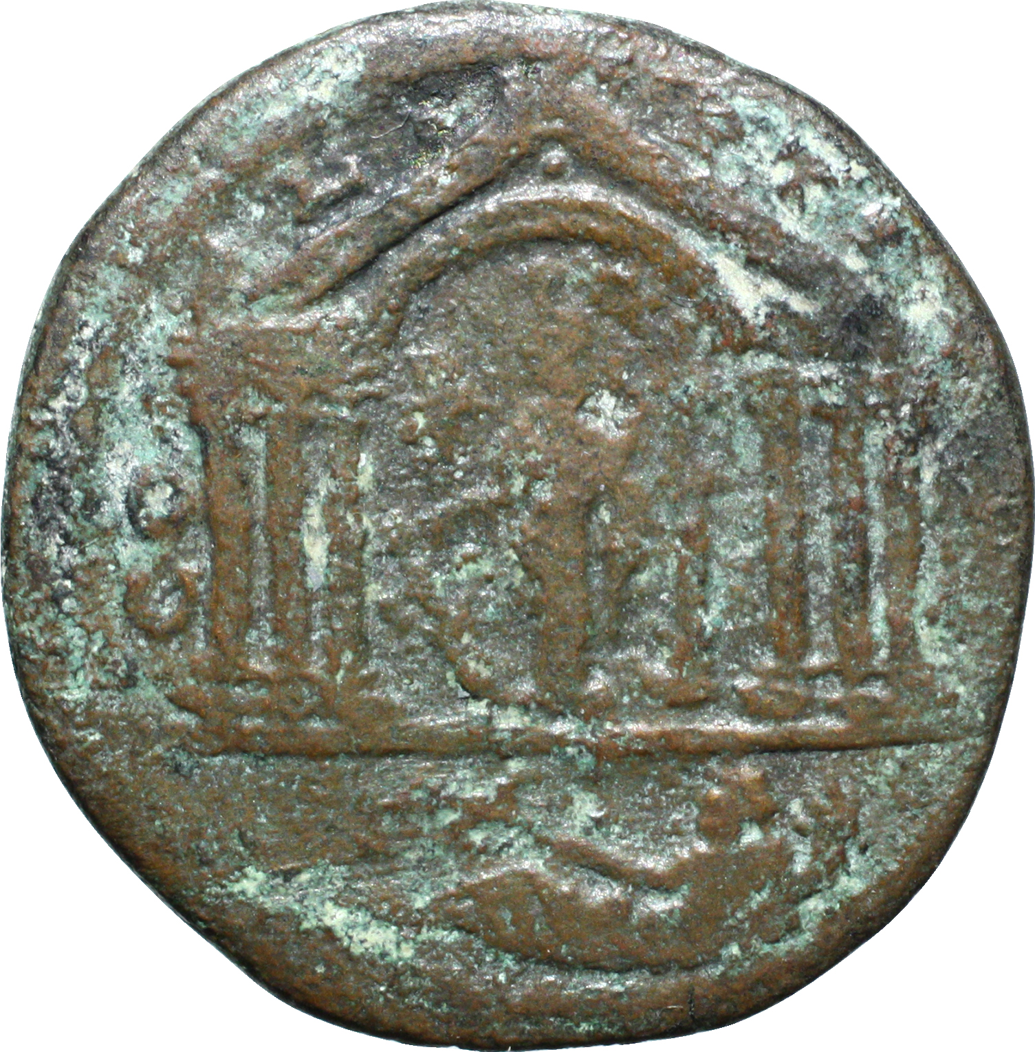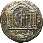 temple with six columns enclosing star and Fortuna standing left, holding rudder and cornucopia, crowned by Victory standing on column; below, river god reclining left, holding reed and cornucopia