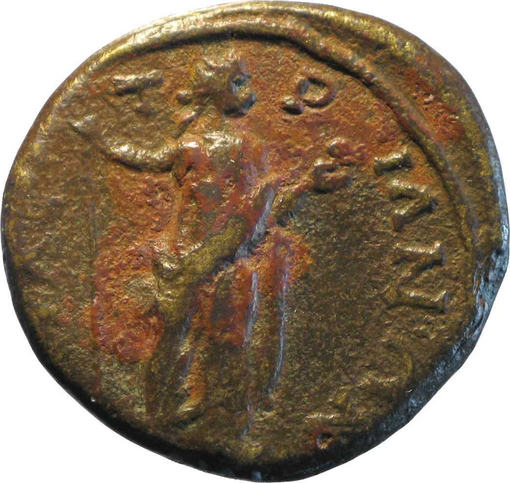 Aphrodite Meleia standing facing, head right, holding sceptre and apple