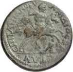 Septimius Severus in military dress on horseback, right, his mantle floating behind him, holding spear in left; below the horse, a bound captive