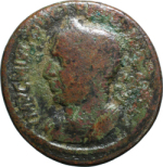 in upper register, temple with four columns containing figure standing left, hand raised, uncertain object over shoulder; below, grotto containing river god Chrysoroas reclining left, holding reed and resting on urn, water flowing beneath; to left, star; to right, crescent; bottom left, altar |