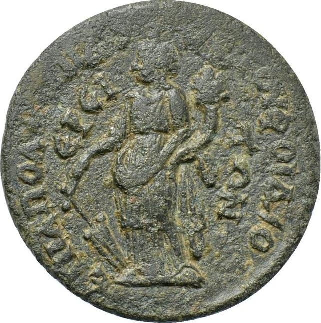 Tyche standing left, holding rudder and cornucopia |