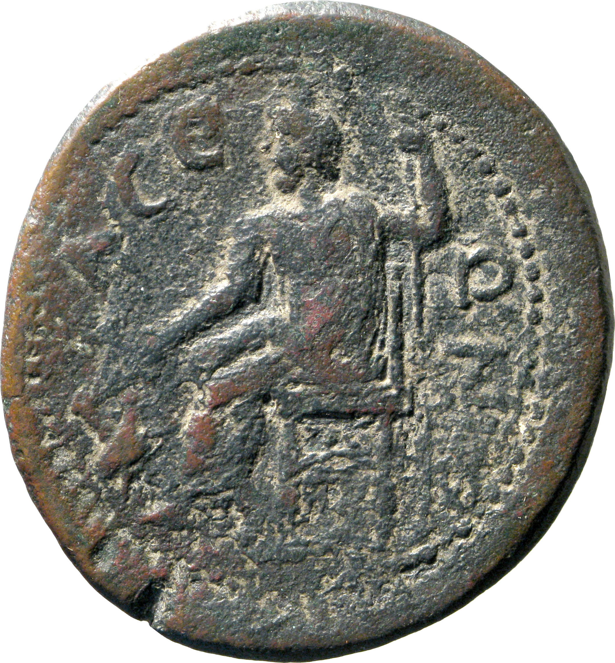 Sarapis seated left, extending right arm over Cerberus, holding sceptre