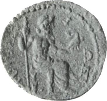 Zeus seated right, on stool holding vertical sceptre in upraised right and eagle looking back with wreath in beak in left