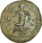 Heracles, naked, seated left on rock, holding cantharus in out-stretched right hand, resting left hand on club |