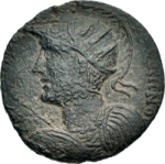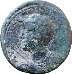 radiate, helmeted and cuirassed bust of Gallienus, left, seen from front, holding spear in right and shield in left