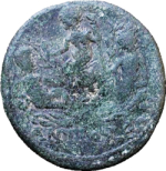 Zeus seated in centre holding sceptre in left and extending right over river god left; to right, another river god (?) holding palm-branch in right