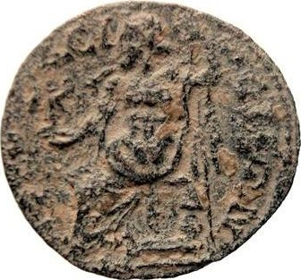 Zeus seated left, holding sceptre in left and statuette of Nike in extended right