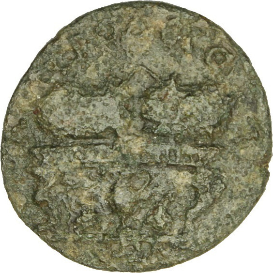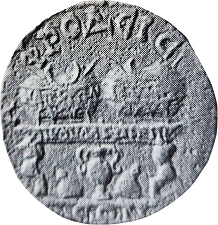 two prize crowns, both inscribed, on table, inscribed, with curved legs; beneath table, amphora with two purses |