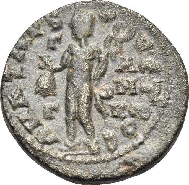 Hermes standing left, holding purse in right and caduceus in left |